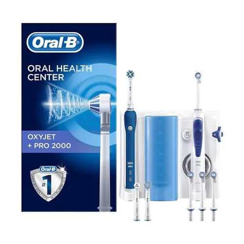 Braun Oral B PRO 2000 – Mundpflegestation: elektrischer Zahnbürstengriff + Oxyjet-Irrigator mit Braun-Technologie, 4 Oxyjet-Köpfe, 3 Ersatzköpfe