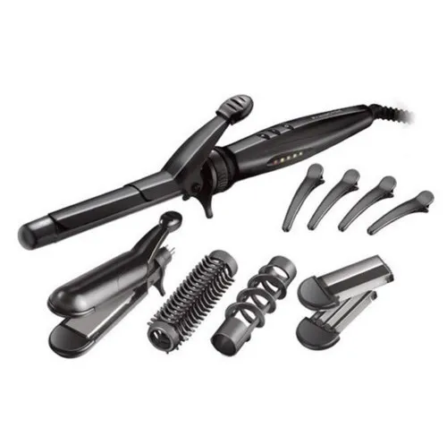 Lockenstab mit 5 austauschbaren Stäben und keramischer Turmalin-Beschichtung. Der Lockenstab verfügt über ein digitales Thermostat mit fünf Stufen von 80 bis 210 Grad Celsius.